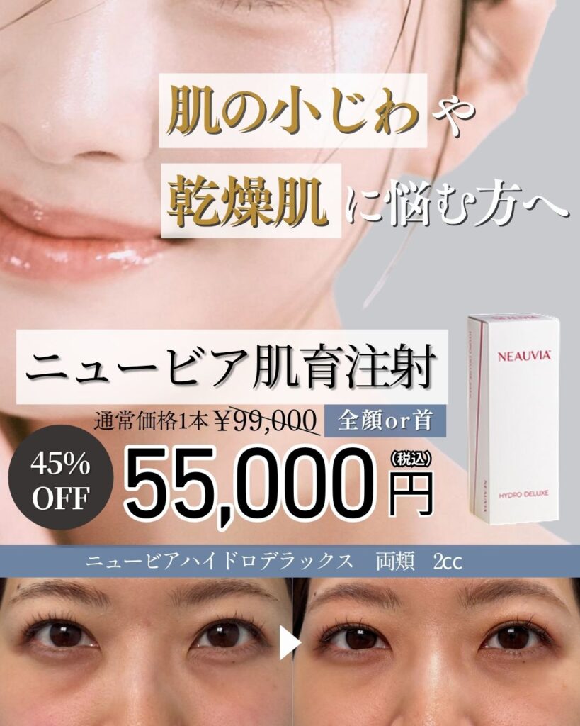 当院では、ニュービアを通常価格 99,000円 → 導入キャンペーン価格 55,000円(税込)でご提供中です。さらに、医師による丁寧なカウンセリングと、痛みに配慮した施術で初めての方も安心です。