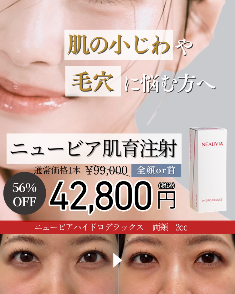当院では、ニュービアを通常価格 99,000円 → 導入キャンペーン価格 42,800円(税込)でご提供中です。さらに、医師による丁寧なカウンセリングと、痛みに配慮した施術で初めての方も安心です。