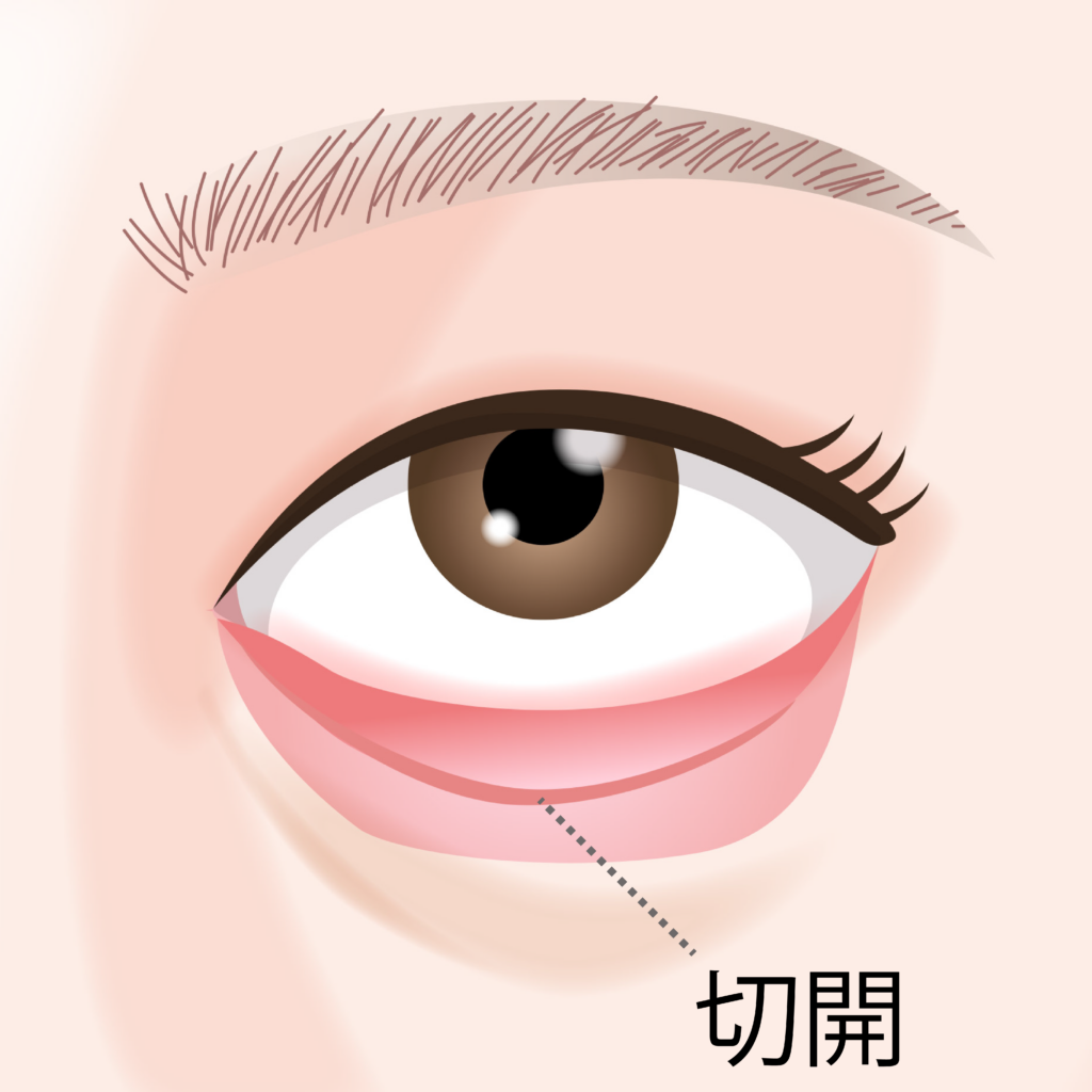 裏ハムラ法は、皮膚の切開を伴わずに、目の下の膨らみと凹みを同時に改善できる手術です。下まぶたの裏側(結膜側)から切開して、膨らみの原因となっている眼窩脂肪を凹んでいる目袋の下の溝に移動させます。